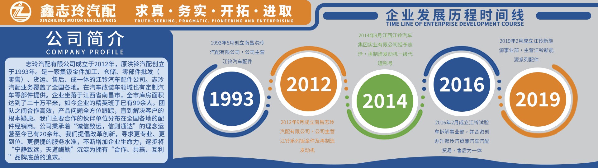 公司組成的“鑫志玲汽配”,業務包括江鈴汽車零部件及覆蓋件、銷售、物流、售后、鈑金件定制等,涉及江鈴的車型有、全順、特順、途睿歐、v362、v348、域虎3~9、寶典、領界、撼路者、D-MAX、鈴拓、mu-x牧游俠、瑞邁、易致新能源系列、馭勝、騏鈴、陸風、輕卡凱運、順達汽車等30多款車型,整體年度營業規模超1.5億元。 南昌志玲汽配將繼續堅持誠信、修行、務實、進取的精神發展方針,做到更專業汽車配件,為客戶排憂解難。形成經營專業化、發展規范化、模式標準化的企業平臺。力爭成為世界知名企業的首選供應商。南昌志玲汽配將繼續堅持誠信、合作、務實、進取的共贏發展方針,形成產業多元化、發展規?;⒔洜I專業化的產銷經營格局。